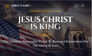 Let’s take a look at the second site, ChristianNationalist.com. This site was created within the past 3 months by by Andrew Torba, the CEO of social media platform Gab, this recently published site fleshes out the foundations of the Christian Nationalist Vision: “To Restore Christendom For The Glory of God.” Its definition goes like this: “Christian Nationalism is loving your neighbor by ordering your nation—its laws, culture, and institutions—toward the good, the true, and the beautiful under the kingship of Jesus Christ.”