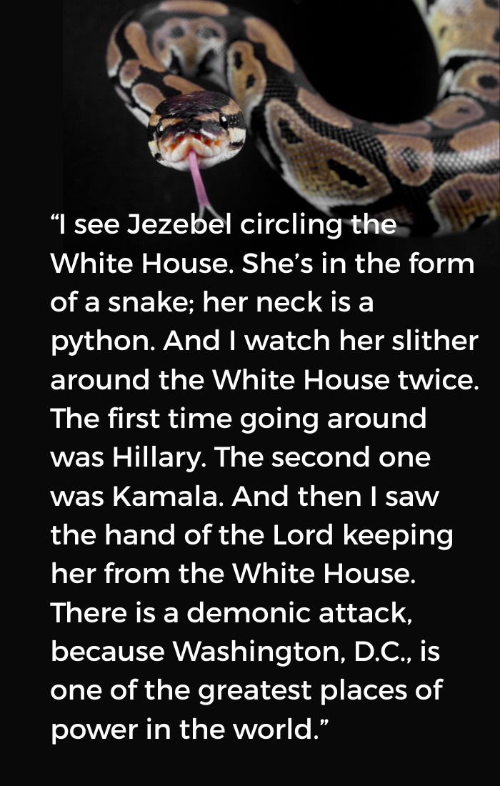 “I see Jezebel circling the White House,” he said in December, referring to the biblical character often associated with idolatry and sexual impurity. “She’s in the form of a snake; her neck is a python. And I watch her slither around the White House twice. The first time going around was Hillary [Clinton]. The second one was Kamala [Harris]. And then I saw the hand of the Lord keeping her from the White House. There is a demonic attack, because Washington, D.C., is one of the greatest places of power in the world.”